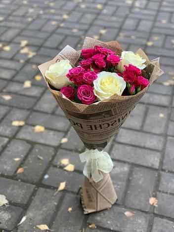 Этим букетом, выполненным в насыщенной цветовой гамме, вы сможете порадовать любимую женщину, близкого вам человек, коллегу творческой профессии. Он прекрасно выступит в роли подарка к любому празднику. Букет выполнен из кустовых и одноголовых роз в оригинальной упаковке.